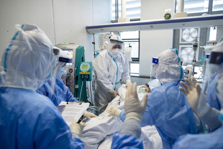 在华中科技大学同济医学院附属同济医院中法新城院区ICU病房,北京协和医院内科重症医学科主任杜斌(中)