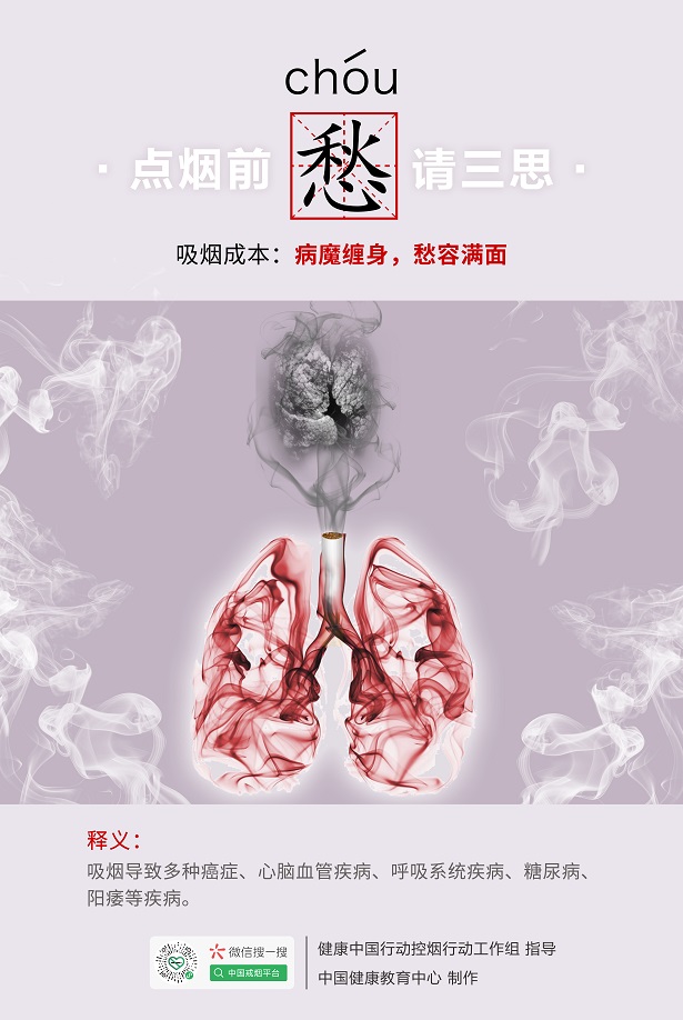 中国健康教育中心开发设计了《点烟前,请三思》系列海报,揭示吸烟的成本与代价,倡导大家积极参与控烟,主动远离烟草危害,勇于对二手烟说不,珍视身边亲人的健康和幸福,践行文明健康绿色环保的生活方式,做自己健康的第一责任人。